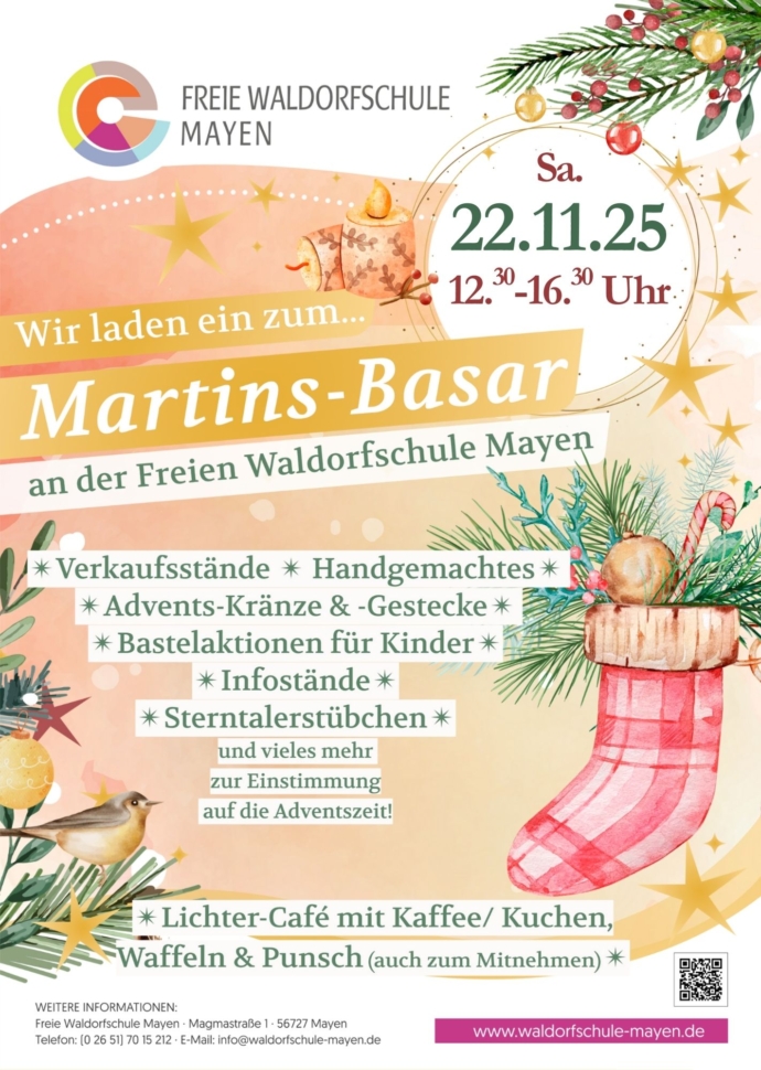 Stimmungsvoller Martinsbasar am Samstag, den 22. November 2025 von 12.30 Uhr bis 16.30 Uhr an der Freien Waldorfschule Mayen (Magmastraße 1, 56727 Mayen) in lichtvoller, vorweihnachtlicher Atmosphäre für alle Familien und Interessierten. Ein Markt zum Stöbern und Verweilen: Liebevoll gestaltete Handarbeiten und Kreatives der Eltern und der Schüler*innen (Geschnitzte Zwerge, Filzfiguren, Genähtes, Deko u.v.m.) Schöne…