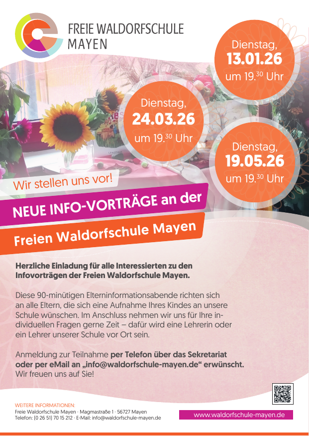 Dienstag, den 13.01.2026, Dienstag, den 24.03.2026 und Dienstag, den 19.05.2026 um 19:30 Uhr Infovortrag Waldorfschule Mayen